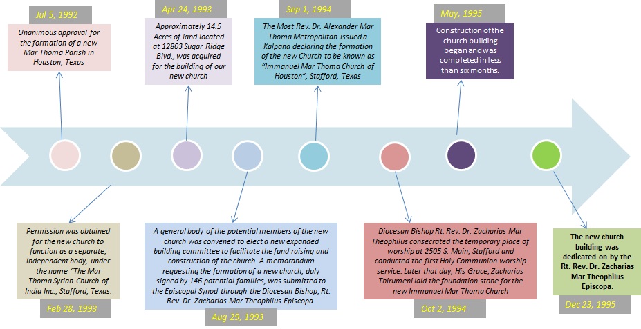Immanuel Mar Thoma Church of Houston, Texas was formed on September 01, 1994, marking another milestone in the journey of the Mar Thoma Church in North America. The grace of God, the vision and dedication of a few lay leaders of the parish and the timely guidance of our then Diocesan Bishops Rt. Rev. Dr. Philipose Mar Chrysostom Suffragan Metropolitan and Rt. Rev. Dr. Zacharias Mar Theophilus Episcopa, and clergies Rev. Eapen Cherian, Rev. T.I. Joseph, and Rev. Raju George paved the way for the formation of a second Mar Thoma Church in Houston. Initially, the parish consisted of 140 families, nearly all of whom were members of the Trinity Mar Thoma Church of Houston.